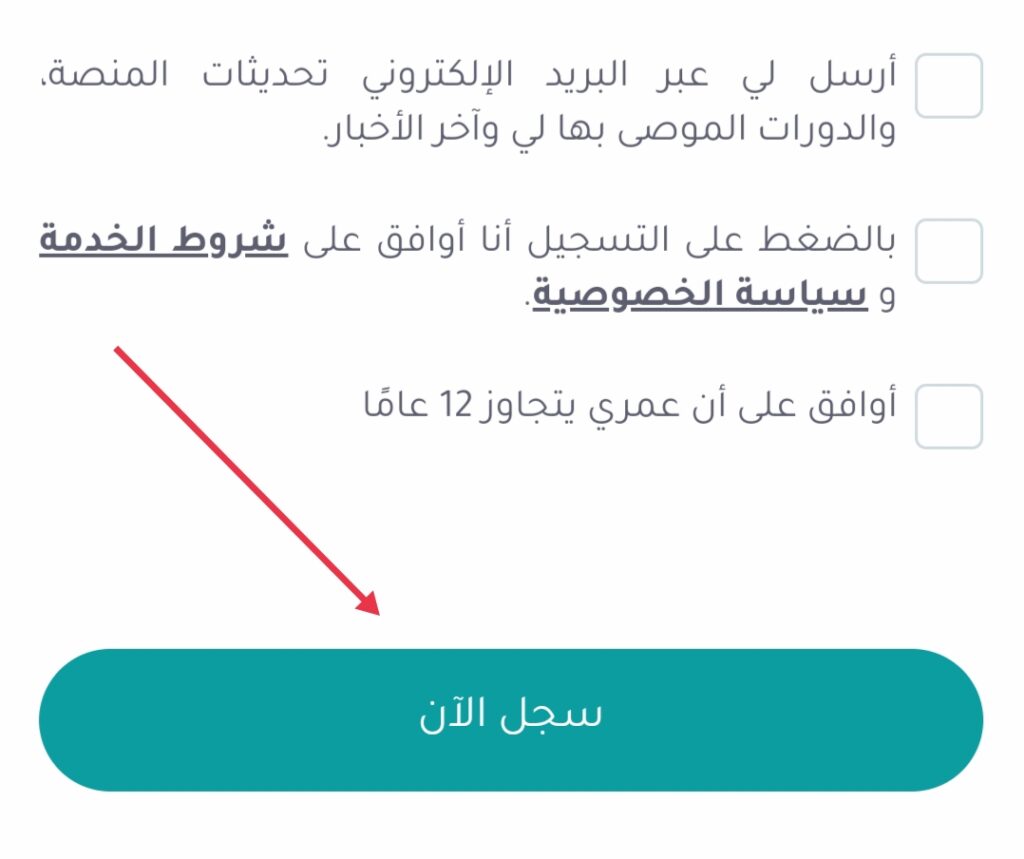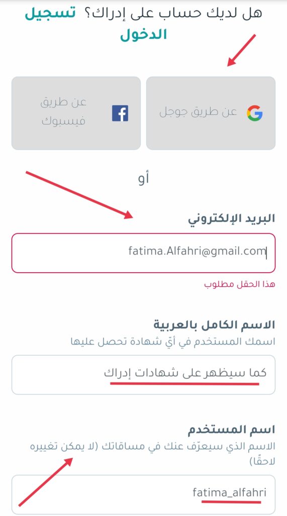 - يمكن اختصار الكثير من الخطوات بالتسجيل عن طريق جوجل وربط حساب إدراك به.